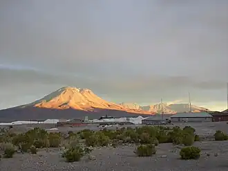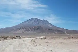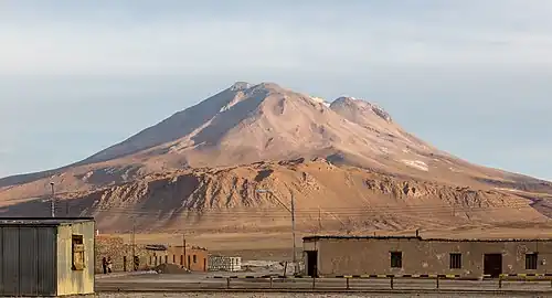 Ollagüe straddles the border between Chile and Bolivia, with most of the edifice lying on the Bolivian side.[9] The Chilean portion lies in the commune of Ollague, in the El Loa province of the Antofagasta Region,[10] while the Bolivian segment lies in the Potosi department.[11] Towns and human sites close to Ollagüe are Amincha,[10] Buenaventura,[12] Cosca, El Chaco, Ollague[13] and Santa Rosa,[14] and the main road of Ollagüe runs along the western foot of the volcano.[12] The first documented ascent was in 1888.[15] The mountain reportedly can be climbed from the eastern side.[16] The occurrence of warning signs about minefields has been reported.[17]