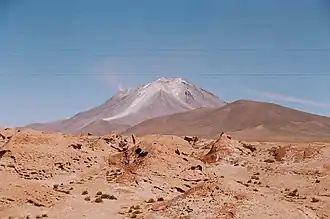 A major fumarole is active on the summit of the volcano, its plume reaching heights of 100 metres (330 ft).[51] It is strong enough that it can be seen on the ground from over 10 kilometres (6.2 mi) away.[86] The vent of the fumarole lies in the summit lava domes,[51] more specifically in a 200 metres (660 ft) high and 350 metres (1,150 ft) wide collapse scar in the southeasternmost lava dome of the compound summit lava dome.[35] Other volcanoes in the area with fumarolic activity include San Pedro and Putana.[87]