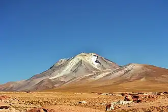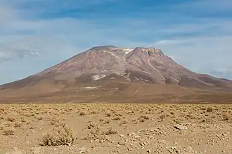 Ollagüe (Spanish pronunciation: [oˈʎaɣwe]) or Ullawi (Aymara: [uˈʎawi]) is a massive andesite stratovolcano in the Andes on the Bolivia–Chile border, within the Antofagasta Region of Chile and the Potosi Department of Bolivia. Part of the Central Volcanic Zone of the Andes, its highest summit is 5,868 metres (19,252 ft) above sea level and features a summit crater that opens to the south. The western rim of the summit crater is formed by a compound of lava domes, the youngest of which features a vigorous fumarole that is visible from afar.
