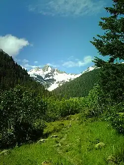 In the west, the subalpine zone is dominated by mountain hemlock.[20] It occurs along with subalpine fir from 1,100 to 1,650 metres (3,610 to 5,410 ft) in the Bailey Range; however, the range of this forest type is not extensive and does not extend much west of Mount Olympus, nor is it common in the east. Chamaecyparis nootkatensis|Yellow-cedar is sometimes found in relation to these plants.[23] In the east and other drier areas, the subalpine zone is dominated by subalpine fir.[20] It can occur with other trees, including mountain hemlock, silver fir, and yellow-cedar, but what characterizes these zones is the dominance of subalpine fir. These forests occur on the eastern ridges from 1,300 to 1,800 metres (4,300 to 5,900 ft).[23]