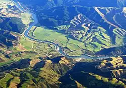 In the southeastern corner of Otago lies The Catlins,[16] an area of rough hill country which geologically forms part of the Murihiku terrane, an accretion which extends inland through the Hokonui Hills in the Southland region. This itself forms part of a larger system known as the Southland Syncline, which links to similar formations in Nelson (offset by the Alpine Fault) and even in New Caledonia, 3,500 km (2,200 mi) away.[17]