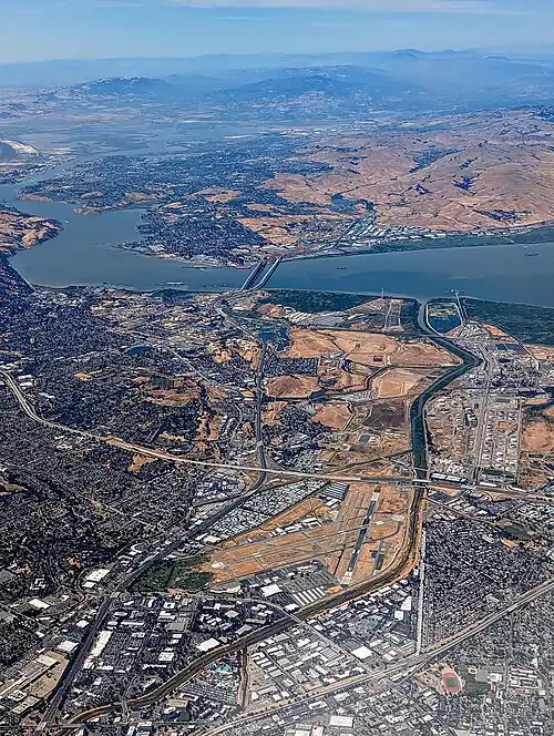Aerial view of Pacheco Creek (center right), with mouth at Suisun Bay and source just above Buchanan Field Airport at the confluence of Walnut Creek (lower center) and Grayson Creek