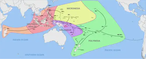 At around 1300 to 1200 BCE, a branch of the Austronesian migrations known as the Lapita culture reached the Bismarck Archipelago, the Solomon Islands, Vanuatu, Fiji, and New Caledonia. From there, they settled Tonga and Samoa by 900 to 800 BCE. Some also back-migrated northwards in 200 BCE to settle the islands of eastern Micronesia (including the Carolines, the Marshall Islands, and Kiribati), mixing with earlier Austronesian migrations in the region. This remained the furthest extent of the Austronesian expansion into Polynesia until around 700 CE when there was another surge of island exploration. They reached the Cook Islands, Tahiti, and the Marquesas by 700 CE; Hawaiʻi by 900 CE; Rapa Nui by 1000 CE; and finally New Zealand by 1200 CE.[14][17][18] Austronesians may have also reached as far as the Americas, although evidence for this remains inconclusive.[19][20]