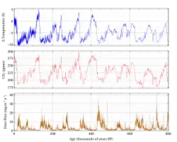 - ↑ Jouzel, Jean; Masson-Delmotte, V.; Cattani, O.; Dreyfus, G.; Falourd, S.; Hoffmann, G.; Minster, B.; Nouet, J.; et al. (10 August 2007). "Orbital and Millennial Antarctic Climate Variability over the Past 800,000 Years" (PDF). Science. 317 (5839): 793–796. Bibcode:2007Sci...317..793J. doi:10.1126/science.1141038. PMID 17615306. S2CID 30125808.