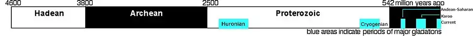The Precambrian took place between the time when Earth first formed 4.6 billion years (Ga) ago, and 542 million years ago. The Precambrian can be split into two eons, the Archean and the Proterozoic, which can be further subdivided into eras.[27] The reconstruction of the Precambrian climate is difficult for various reasons including the low number of reliable indicators and a, generally, not well-preserved or extensive fossil record (especially when compared to the Phanerozoic eon). [28][29] Despite these issues, there is evidence for a number of major climate events throughout the history of the Precambrian: The Great Oxygenation Event, which started around 2.3 Ga ago (the beginning of the Proterozoic) is indicated by biomarkers which demonstrate the appearance of photosynthetic organisms. Due to the high levels of oxygen in the atmosphere from the GOE, CH4 levels fell rapidly cooling the atmosphere causing the Huronian glaciation. For about 1 Ga after the glaciation (2–0.8 Ga ago), the Earth likely experienced warmer temperatures indicated by microfossils of photosynthetic eukaryotes, and oxygen levels between 5 and 18% of the Earth's current oxygen level. At the end of the Proterozoic, there is evidence of global glaciation events of varying severity causing a 'Snowball Earth'.[30] Snowball Earth is supported by different indicators such as, glacial deposits, significant continental erosion called the Great Unconformity, and sedimentary rocks called cap carbonates that form after a deglaciation episode. [31]