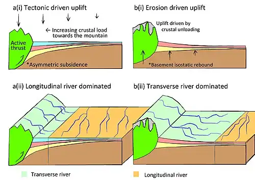 Erosion driven uplift results in transverse rivers dominating the area instead of longitudinal rivers. During active erosion and isostatic rebound, accommodation space is reduced quickly and continually, while sedimentation rate is also high. Therefore, transverse rivers developed on the uplifted mountain range are able to extend way beyond the foot of the mountain range. Longitudinal rivers only dominate distal parts of the drainage basin.[42]