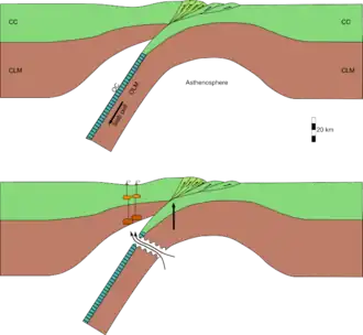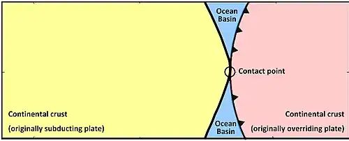 The onset of continental collision is determined by any point along the plate boundary where the oceanic lithosphere is completely subducted and two continental plates first come into contact.[4] In the case of the India–Asia collision, it would be defined by the first point of disappearance of the Neo-Tethys oceanic crust, where the India and Asia continent come into contact with each other. Such process is defined by a point since the shape of continental margins is irregular. The complete consumption of the oceanic crust could occur non-synchronously along the collision front.[5] Different methods can be used to constrain the age of collision onset. Commonly used geological evidences include stratigraphy, sedimentology and paleomagnetic data. Stratigraphy and sedimentology indicates the transfer of materials from one continent to another when two continents, meet, as well as the change in depositional environment after the oceanic basin is closed and sea water is completely expelled.[6] Paleomagnetic data indicates collision when the paleolatitudes of both continental margins overlap.[7]