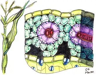 ![]() Cross section of a maize leaf, a C4 plant. Kranz anatomy (rings of cells) shown. Drawing based on microscopic images courtesy of Cambridge University Plant Sciences Department. |