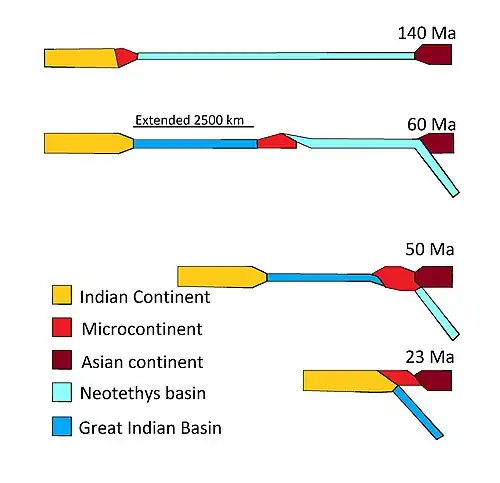 The Greater India Basin hypothesis suggests that there was a two-stage collision between India and Asia continent.[9] The first stage occurred at approximately 50 Ma, where a microcontinent from the Indian plate collided with the Asian continent.[9] It was followed by the subduction of the oceanic Great India Basin, which was located in between the microcontinent and the major Indian craton, under the Asian continent.[9] The second stage of collision occurred after the oceanic crust of the Great India Basin had been consumed, where the major Indian craton finally came into contact and collided with the Asian continental margin (including the previously "merged" microcontinent, which was interpreted to be the modern Tibetan Plateau) at 25–20 Ma.[9]