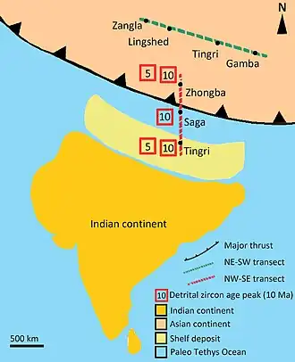 - 1 2 3 DeCelles, P. G.; Kapp, P.; Gehrels, G. E.; Ding, L. (2014). "Paleocene-Eocene foreland basin evolution in the Himalaya of southern Tibet and Nepal: Implications for the age of initial India–Asia collision". Tectonics. 33 (5): 824–849. Bibcode:2014Tecto..33..824D. doi:10.1002/2014tc003522. ISSN 0278-7407. S2CID 55179413.