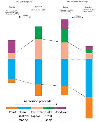 - Facies changes (NE-SW): stratigraphic correlations of Paleocene to early Eocene across the NE-SW orientation of the Himalayas shows that the change in depositional environment is similar in time, with no unconformity and only a few tens of meters of vertical differences.[5] This suggests that the whole Indian continental margin collided with the Asian continental margin at approximately the same time.[5]