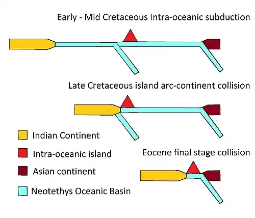 The Paleogene arc-continent collision suggests that the Indian continent experienced a two-stage collision.[8] The first stage involves the collision with an intraoceanic island arc in the Tethys Ocean at approximately 55 million years (Ma) ago.[8] The second stage involves the collision between the Indian continent (together with the "merged" island arc) and the Asian continent at approximately 33 Ma.[8]