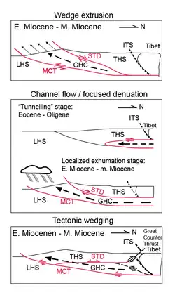- ↑ Beaumont, C.; Jamieson, R. A.; Nguyen, M. H.; Lee, B. (2001). "Himalayan tectonics explained by extrusion of a low-viscosity crustal channel coupled to focused surface denudation". Nature. 414 (6865): 738–742. Bibcode:2001Natur.414..738B. doi:10.1038/414738a. ISSN 0028-0836. PMID 11742396. S2CID 4382486.