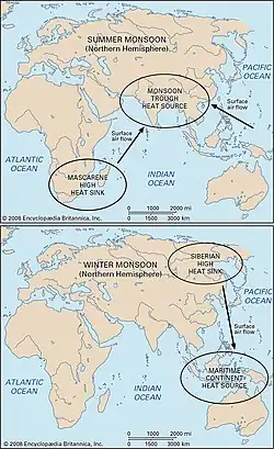 - ↑ Wu, Guoxiong; Zhang, Yongsheng (1998). "Tibetan Plateau Forcing and the Timing of the Monsoon Onset over South Asia and the South China Sea". Monthly Weather Review. 126 (4): 913–927. Bibcode:1998MWRv..126..913W. doi:10.1175/1520-0493(1998)126<0913:tpfatt>2.0.co;2. ISSN 0027-0644. S2CID 124783607.