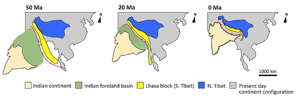 By the time when the Indian continent and the Asian continent collided, South Tibet has already reached 3–4 km elevation.[29][30][31][33] The compressional force resulted from the Indian-Asian collision further topped up Lhasa block's elevation and triggered crustal thickening in the North Tibet as the Indian continent proceed northwards.