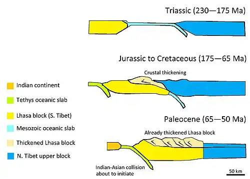 In the Mesozoic time, there was an oceanic basin in between the Lhasa block and the North Tibet continental block. Subduction of the oceanic slab underneath the North Tibet block started in the Triassic. In Jurassic to Cretaceous, the Mesozoic ocean is closed. The Lhasa continental block and the North Tibet continental block collided with each other, resulting in intense crustal shortening and thickening of the Lhasa block, i.e. South Tibet.[31] The closing of Mesozoic ocean, the continental collision between Lhasa block and North Tibet block and the early crustal thickening of Lhasa block is indicated by the presence of ultra-high pressure metamorphic rocks in the Qiangtang metamorphic belt in Central Tibet.[40]