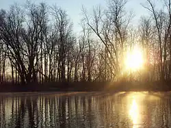 There are also two lakes within Penns Valley, each which are controlled by dams: Poe Lake and Colyer Lake. Being fed by Sinking Creek, Colyer Lake is located on the western boundary of Penns Valley and has a surface area of 77 acres. Boating and fishing are permitted and as part of the Cooperative Fish Habitat Improvement Program through the Pennsylvania Fish and Boat Commission, the lake has been host to fish habitat structures to support fish populations. As of March 2013 Colyer Lake has been slated for indefinite draining until deficiencies in the dam can be resolved.[4][5] Poe Lake is a 25-acre lake at the southern boundary of Penns Valley. The lake is located in Poe Valley State Park which, in turn, is surrounded by 198,000 acre Bald Eagle State Forest. The lake itself was named for the Big Poe Creek which feeds the reservoir. Access to the reservoir and the reservoir's dam were both constructed by the CCC in the mid to late 1930s, specifically with the dam being completed in 1937.[6][7]