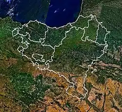 The main natural limits of the Basque Country are the Bay of Biscay (south-east of Cantabrian Sea) to the north and westside, and in the south side, the Ebro river. The highest point in the Basque Country is the Hiru Erregeen Mahaia peak (2438 m high).