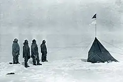 Amundsen's South Pole expedition, with Amundsen and four others, arrived at the pole on 14 December 1911,[4] five weeks ahead of a British party led by Robert Falcon Scott as part of the Terra Nova expedition. Amundsen and his team returned safely to their base, and later learned that Scott and his four companions had died on their return journey.