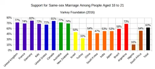 The 2016 Varkey Foundation and Populus survey also asked about people's viewpoints on moral questions regarding sex and gender. Overall, 89% supported equality between men and women, with support being the highest in Canada and China (both 94%), and the lowest in Japan (74%) and Nigeria (68%). 74% favored recognizing transgender rights, but with large national differences, from an overwhelming majority of 83% in Canada to a bare majority of 57% in Nigeria. 63% approved of same-sex marriage, but there were again huge variations among countries. 81% of young Germans and 80% of young Canadians agreed that same-sex couples should be allowed to marry, compared to only 33% of young Turks and 16% of young Nigerians who did.[55][56] In a 2018 Pew Research Center survey, 48% of Generation Z participants said that same-sex marriage was good for society.[7]