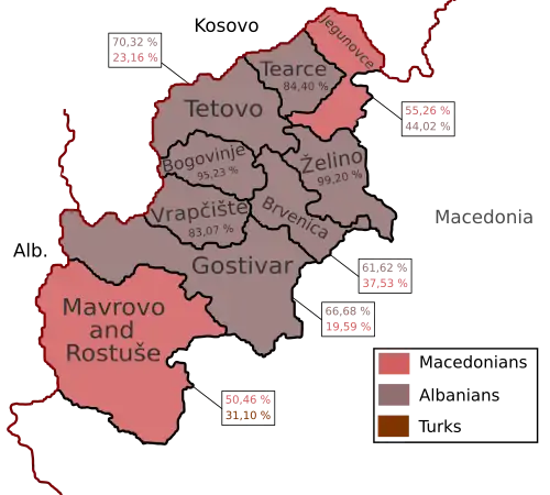 The largest ethnic group in the region are the Albanians (68.91%) followed by the Macedonians (17.21%), Turks (6.04%), Roma (1.7%).