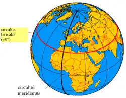 The Greenwich meridian is a prime meridian, a geographical reference line that passes through the Royal Observatory, Greenwich, in London, England.[1] From 1884 to 1974, the Greenwich meridian was the international standard prime meridian, used worldwide for timekeeping and navigation. The modern standard, the IERS Reference Meridian, is based on the Greenwich meridian, but differs slightly from it.[1] This prime meridian (at the time, one of many) was first established by Sir George Airy (in 1851). In 1883, the International Geodetic Association formally recommended to governments that the meridian through Greenwich be adopted as the international standard prime meridian. In October of the following year, at the invitation of the President of the United States, 41 delegates from 25 nations met in Washington, D.C., United States, for the International Meridian Conference.[2] This inter-governmental conference selected the meridian passing through Greenwich as the world standard prime meridian.[a] However, France abstained from the vote, and French maps continued to use the Paris meridian for several decades. In the 18th century, London lexicographer Malachy Postlethwayt published his African maps showing the "Meridian of London" intersecting the Equator a few degrees west of the later meridian and Accra, Ghana.[4]
