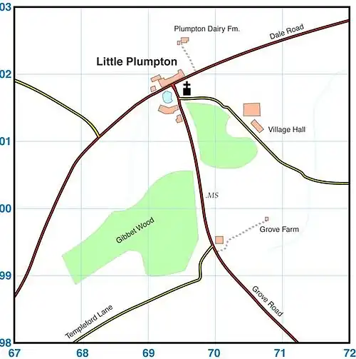For the church in Little Plumpton, this gives the digits 6 and 7 (6 on the left to right axis (Eastings) and 7 on the bottom to top axis (Northings). These are added to the four-figure grid reference after the two digits describing the same coordinate axis, and thus our six-figure grid reference for the church becomes 696017. This reference describes a 100-metre by 100-metre square, and not a single point, but this precision is usually sufficient for navigation purposes. The symbols on the map are not precise in any case, for example the church in the example above would be approximately 100x200 metres if the symbol was to scale, so in fact, the middle of the black square represents the map position of the real church, independently of the actual size of the church.