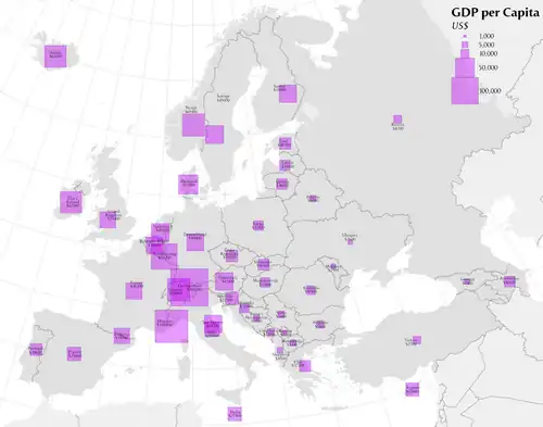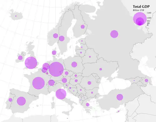 A proportional symbol map or proportional point symbol map is a type of thematic map that uses map symbols that vary in size to represent a quantitative variable.[1]: 131 For example, circles may be used to show the location of cities within the map, with the size of each circle sized proportionally to the population of the city. Typically, the size of each symbol is calculated so that its area is mathematically proportional to the variable, but more indirect methods (e.g., categorizing symbols as "small," "medium," and "large") are also used.