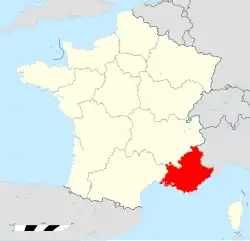 - ↑ French pronunciation: [pʁɔvɑ̃s alp kot dazyʁ] ⓘ; Occitan: Provença-Aups-Còsta d'Azur [pʀuˈvɛnsɔ ˈawps ˈkɔstɔ daˈzyʀ] or Provença-Alps-Còsta d'Azur [pʀuˈvɛnsɔ ˈalps ˈkɔstɔ daˈzyʀ]; Italian: Provenza-Alpi-Costa Azzurra. Literally 'Provence-Alps-Azure Coast', i.e. 'Provence-Alps-French Riviera'.