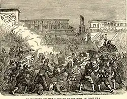 Hernán Cortés entered Puebla state in 1519, along with his indigenous allies from Veracruz, on his way to Tlaxcala.[18] The Spanish takeover of the Puebla area was relatively easy. Many of the peoples here were under Aztec domination and saw the foreigners as a way to escape.[16] One notable exception was the city of Cholula. While negotiating with the city's leaders, Cortés was told of a plot to attack him and his men. Cortés ordered his army to commit the Massacre of Cholula on 12 October 1519. This act terrified those who opposed the Spanish and they submitted.[18] In 1520, after his initial defeat in Tenochtitlan (La Noche Triste) Hernán Cortés founded a Spanish settlement at Tepeaca, and took areas such as Huaquechula and Itzocan. Many natives leaders then provided men and supplies for the conquest of Tenochtitlan in 1521, and later to go with Pedro de Alvarado to Guatemala.[16][17] Local indigenous governments survived in the very early colonial period, subject to the Spanish. These included Tuchpa, Tzicoac, Metztitlán, Tlapacoyan, Atotonilco, Tlatlaquitepec, Huaxtepec, Tepeaca, Tlacozautitlán, Quiauhteopan, Yoaltepec, Teotitlán del Camino, Cuautochco and Coixtlahuacan.[17]