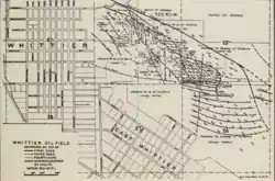 A commercial discovery was made in 1897, for what would become the Whittier Oil Field, when a well was drilled to a depth of 984 feet. The location was in the central area of production. By 1903, about 100 wells were in operation and by 1924, there were 163 commercial wells in operation.[15]