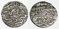 Khizr Khan was succeeded by his son Mubarak Shah after his death on 20 May 1421. Mubarak Shah referred to himself as Muizz-ud-Din Mubarak Shah on his coins, removing the Timurid name with the name of the Caliph, and declared himself a Shah.[63][64] He defeated the advancing Hoshang Shah Ghori, ruler of Malwa Sultanate and forced him to pay heavy tribute early in his reign.[65] Mubarak Shah also put down the rebellion of Jasrath Khokhar and managed to fend off multiple invasions by the Timurids of Kabul.[66]