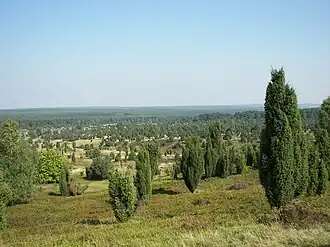 A push moraine or pushed moraine is in geomorphology a moraine (a landform formed by glacial processes) that forms when the terminus advance of a lowland glacier pushes unstratified glacial sediment into a pile or linear ridge in front of it. A push moraine is identified by its ability to push sediment upwards from its original horizontal position. Push moraines are limited in size by the advance of a glacier front and its tendency to shear over the top of any ridge large enough to resist the movement of ice. Pushed moraines generally occur in low, flat plains at higher latitudes and were formed during the glacial stages of the Quaternary ice age. They can be up to 100 km long and several hundreds of metres in height.