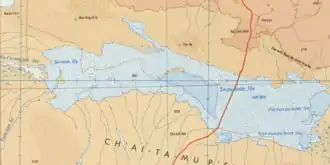 ![]() A map of the Qarhan Playa (1975), showing its lakes Suli ("Se-nieh"), Dabusun ("Ta pu-hsün"), and N. ("Pei") and S. Hulsan ("Nan huo Pu-hsün") | |