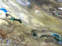 In the playa's hyperarid climate, there is generally only 28–40 mm (1–2 in) of annual rainfall but 3,000–3,564 mm (118.1–140.3 in) of annual evaporation.[5][10] Despite this, meltwater rivers and mineral springs fill the basins of the salt flat's four main sections—Bieletan, Dabusun, Qarhan, and Huoluxun[11][12]—with about ten large but shallow lakes[13] usually collectively occupying an area of about 460 km2 (180 sq mi):[5] Suli Lake in the west, fed from the west by the Urt Moron;[14] the Little and Big Biele Lakes beside it, fed from the south by the Tuolahai and Qingshui Rivers;[15] West Dabusun and Dabusun Lake (the largest),[11] in the center, fed from the south by the Golmud River;[14] Dongling Lake to their northwest; Xiezuo and Tuanjie Lakes to their east, fed respectively by the intermittent Quanji and Shougong Rivers; and North and South Hulsan Lakes at the east end of the playa, fed from the east by the Qaidam,[14] Nuomuhong, and Suolinguole Rivers.[15] All of these are usually less than 1 m (3 ft 3 in) deep.[5] There are also some ephemeral lakes.[16] Most of the streams contributing to these lakes flow north into the playa from the Kunlun and its foothills. The Golmud River is the main contributor, providing a mean annual influx of 19.2 trillion L (5.07 trillion gal) of water.[10] There is also contribution of about 1% from mineral springs,[5] especially on the north end of the playa,[16] which play an important role in the chemical composition of the sediment.