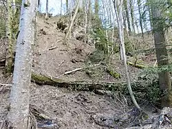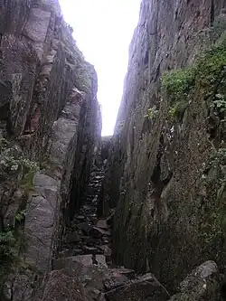 A ravine is a landform that is narrower than a canyon and is often the product of streambank erosion. Ravines are typically classified as larger in scale than gullies, although smaller than valleys.[1] Ravines may also be called a cleuch, dell, ghout (Nevis), gill or ghyll, glen, gorge, kloof (South Africa), and chine (Isle of Wight)