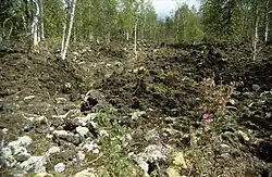 Dragon Cone, just east of Ray Lake, erupted about 7,500 years ago and the lava, called the Dragon's Tongue, flowed 15 km (9.3 mi) down Falls Creek Valley. Ray Lake was dammed and enlarged by this lava. The toe of this lava flow dammed the Clearwater River and raised the level of Clearwater Lake by about 5 m (16 ft). A hiking trail from Clearwater Lake Campground gives access to the Dragon's Tongue where it consists of piles of jagged aa lava.[3]