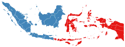 During the last stages of the Dutch colonial era, the area east of Java and Kalimantan was known as the Great East and later known as Eastern Indonesia. On 24 December 1946, the State of East Indonesia was formed covering the same area (excluding Western New Guinea). It was a component of the United States of Indonesia, and was dissolved into the unitary Republic of Indonesia in 17 August 1950.[2] Currently, Eastern Indonesia consists of 17 provinces: Bali, East Nusa Tenggara, West Nusa Tenggara, Central Sulawesi, Gorontalo, North Sulawesi, South Sulawesi, Southeast Sulawesi, West Sulawesi, Maluku, North Maluku, Central Papua, Highland Papua, Papua, South Papua, Southwest Papua, and West Papua.[3][4][5] Meanwhile, the region comprising the other 21 provinces in Sumatra, Java, and Kalimantan is known as Western Indonesia.[6]