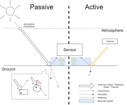 In remote sensing, the electromagnetic radiation acts as the information carrier, with a distance of tens to thousands of kilometers distance between the sensor and the target.[3] Proximal Sensing is a similar idea but often refer to laboratory and field measurements, instead of images showing a large spatial extent.[5] Geophysical methods, for instance Sonar and acoustic methods, shares similar properties with remote sensing but electromagnetic wave is not the sole medium.[6] Geotechnical instrumentations, for example piezometer, tiltmeter and Global Positioning System (GPS), on the other hand, often refer to instruments installed to measure discrete point data, compared to imagery in remote sensing.[6] A suitable sensor sensitive to the particular wavelength region, according to the designated use, is selected and employed to collect the electromagnetic wave reflected or emitted from the target object.[3]