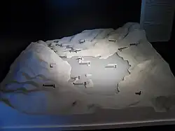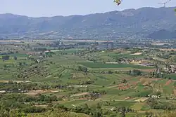 The Rieti Plain has a semi-circular shape and covers around 90 km2 (35 sq mi),[1] ranging from 370 to 380 metres above sea level; it is 14 km long and averages 7 km in width.[2] It is bordered all round by mountains: Monti Sabini to the west and south and Monti Reatini to the east (the highest peak being Monte Terminillo, a popular skiing resort, 2,217 metres (7,274 ft) high).