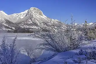![]() Roche Ronde and its reflection in an open section of the Athabasca River | |