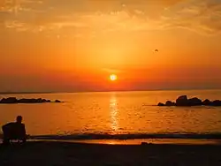 The beach of Rometta facing cape Milazzo and Aeolian islands at the sunset.