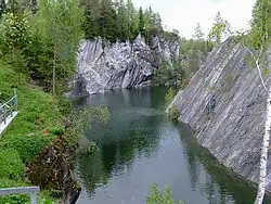 Not far from the settlement, the Ruskeala marble quarries are located. The deposit was discovered in 1765 and has been in operation since 1769. The integrity of the massif of the marble was cracked in the 20th century due to the use of dynamite. For this reason some quarries were abandoned and inundated. Now these picturesque deep quarries and adits with limpid water serve as a popular tourist attraction.