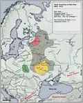 In a broader sense, this name also referred to all territories under control of Kievan princes, and the initial area of Rus' land served as their metropole, yet this wider meaning declined when Kiev lost its power over majority of principalities.[17] After the Mongol Invasion of Kievan Rus' and a massive devastation of the core territory, the name Rus' was succeeded by Galician-Volhynian principality, which declared itself as Kingdom of Rus'.