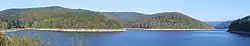 It was the first modern dam and reservoir complex (German: Talsperre) to be built in the Harz[1] and was constructed by the Harzwasserwerke between 1928 and 1931. It is used for flood prevention, electricity generation, supplying drinking water and for raising water levels during times of low water. The construction of the dam cost 14.7 million Reichsmarks at the time. The Harzwasserwerke still operate the dam today. In 1933 construction began on a long-distance water pipe from the Söse reservoir, whose northern branch goes as far as Bremen. Today it mainly supplies towns and communities in the Hildesheim and Hanover areas. Since 1980 the town of Göttingen has also been supplied with drinking water from the reservoir.