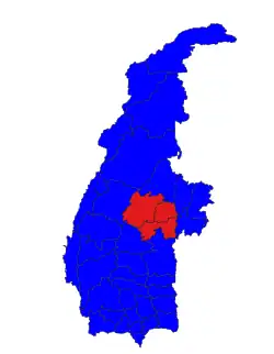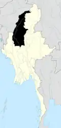 Sagaing Region (Burmese: စစ်ကိုင်းတိုင်းဒေသကြီး, pronounced [zəɡáɪ̯ɰ̃ táɪ̯ɰ̃ dèθa̰ dʑí]; formerly Sagaing Division) is an administrative region of Myanmar, located in the north-western part of the country between latitude 21° 30' north and longitude 94° 97' east. It is bordered by Chin State and India's Nagaland, Manipur, and Arunachal Pradesh states to the west and north, Kachin State, Shan State, and Mandalay Region to the east and Mandalay Region and Magway Region to the south. The Ayeyarwady River forms a greater part of its eastern and also southern boundary. Sagaing Region has an area of 93,527 square kilometres (36,111 sq mi), making it the second-largest subdivision of Myanmar. In 1996, it had a population of over 5,300,000, while its population in 2012 was 6,600,000. The urban population 2012 was 1,230,000, and the rural population was 5,360,000.[4] The namesake of Sagaing Region is Sagaing but the administrative capital and largest city is Monywa.[5][6][7]