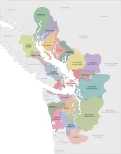 The Coast Salish are the indigenous peoples who live in southwest British Columbia and northwest Washington along the Salish Sea and share a common linguistic and cultural origin. The Coast Salish are seen as one of the main cultural and linguistic branches of a larger group known as Salishan or Salish. Five divisions of the Salish language family are recognized, with Coast Salish and Interior Salish being the primary two. The Salish family consists of 23 separate languages.[9] European and American explorers first encountered Salishan people along the Pacific Northwest coast in the late 18th century. The first detailed information was obtained by the Lewis and Clark Expedition of 1804–1806.[10] The term "Salish" was originally applied only to the Interior Salish Flathead tribe living in the region of Flathead Lake, Montana.[10][11] By the mid-20th century, it had been extended to cover all people speaking a similar language.[12] The Flathead Nation continues to refer to their language and culture as Salish.[13][14] A variant name for Flathead Lake is "Selish Lake".[15] The name Salish Sea was coined only in the late 20th century. No overarching title exists for this area or even a commonly shared name for any of the waterbodies in any of the Coast Salish languages.