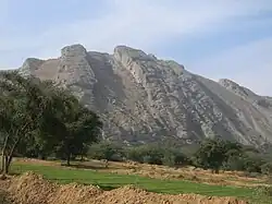 The Salt Range (Punjabi: سلسلہ کوہ نمک, romanized: Silsila Koh Namakīn) is a mountain range in the north of Punjab[1] province of Pakistan, deriving its name from its extensive deposits of rock salt.[1][2] The range extends along the south of the Potohar Plateau and the north of the Jhelum River. The Salt Range contains the great mines of Khewra, Kalabagh and Warcha which yield vast supplies of salt.[1] Coal of a medium quality is also found here.[1] The Salt Range starts from the Bakralla and Tilla Jogian ridges in the east and extends to the west of River Jhelum.[3]