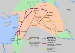 Following the Assyrian conquest, Sargon II claimed in Assyrian records to have deported 27,280 people to various places throughout the empire, mainly to Guzana in the Assyrian heartland, as well as to the cities of the Medes in the eastern part of the empire (modern-day Iran).[21][22][23] The deportations were part of a standard resettlement policy of the Neo-Assyrian Empire to deal with defeated enemy peoples.[24] The resettled people were generally treated well as valued members of the empire and transported together with their families and belongings.[25][26][27] At the same time, people from other parts of the empire were resettled in the depopulated Samerina.[28] The resettlement is also called the Assyrian captivity in Jewish history and provides the basis for the narrative of the Ten Lost Tribes.[24]
