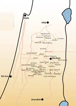 The area known as the hills of Samaria is bounded by the Jezreel Valley(north); by the Jordan Rift Valley (east); by the Carmel Ridge (northwest); by the Sharon plain (west); and by the Jerusalem mountains (south).[16]
